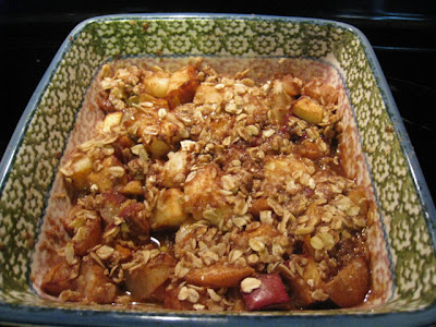 I found this recipe at the Common Room Kitchen blog and decided to make it a few days ago. I halved the recipe and since I only had 2 small pears, I added 1 apple to the mix (I didn't peel anything). I love this crisp. I have never made a truly successful crisp. All of them have been good, but not worth keeping. This recipe is definitely a keeper! I served it after lunch and it all disappeared. :)