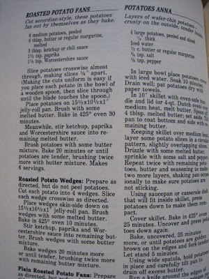 I went with the Farm Journals Best-Ever Vegetable Recipes. I like old cookbooks, even if they are not the prettiest cookbooks to photograph. I tried to compensate for the ugliness by placing a pumpkin next to it. Did it help? Anyway, what I love the most about this cookbook is that it contains a large amount of recipes and each recipe is broken down into different versions (roasted potatoes are broken down into roasted potato wedges and so on). Sometimes they require new ingredients and other times it's just about slicing them differently (see above picture).