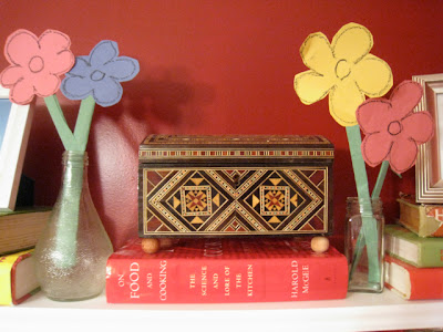 I do more than cook! I also play with construction paper, glue and crayons. hehehe My toddler and I made paper flowers for the shelf. When I say "we," of course I mean "me." She mostly ate crayons and glue. Yikes! I thought she would be very impressed with my flowers, but she tore them to shreds. :) Also, notice the box between the flowers? My husband bought that for me almost 10 years ago, while we were dating. I love, love, love it. I also decorated the house with more chili peppers.......